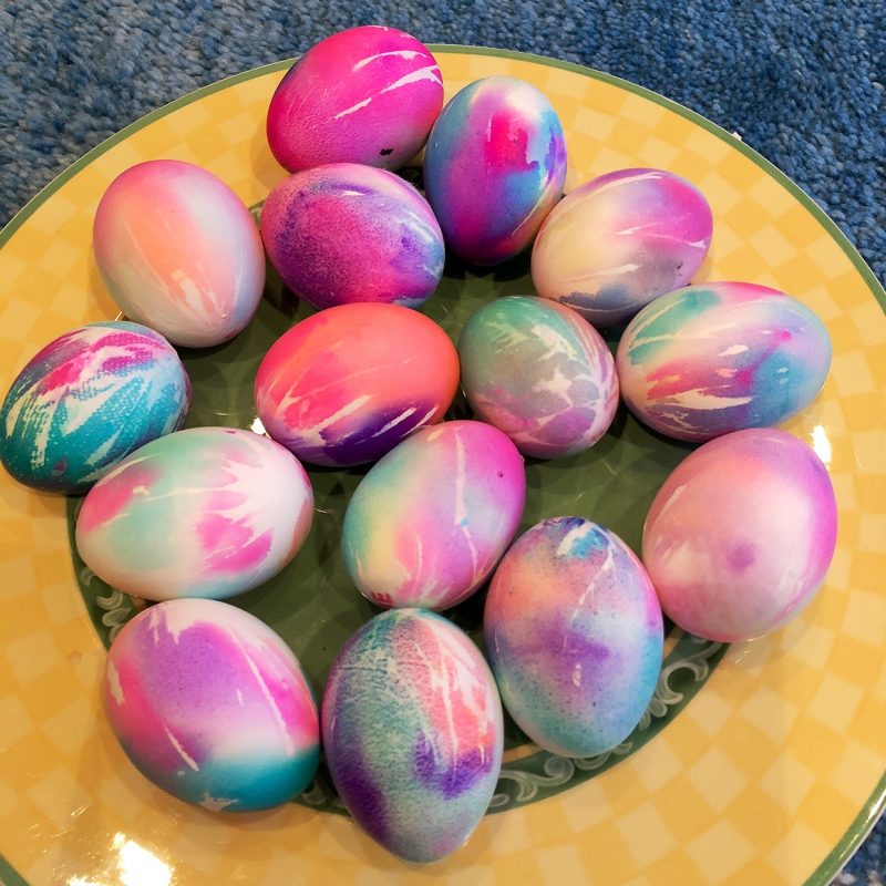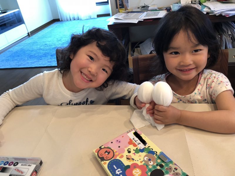 いつもは卵にお絵かきしてから、色水にポチャンで
